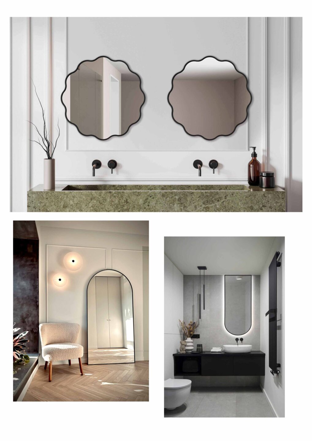 Lustro do sypialni w stylu quiet luxury – finezyjne, nieregularne lustro nad toaletkę, może być także z opcją podświetlenia do makijążu; lub duże stojące lustro do oparcia o ścianę – ponadczasowe lustro z łukiem w ramie lub trendowe lustro fala
