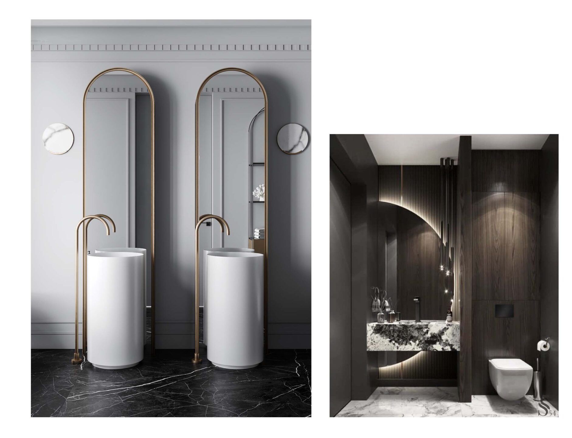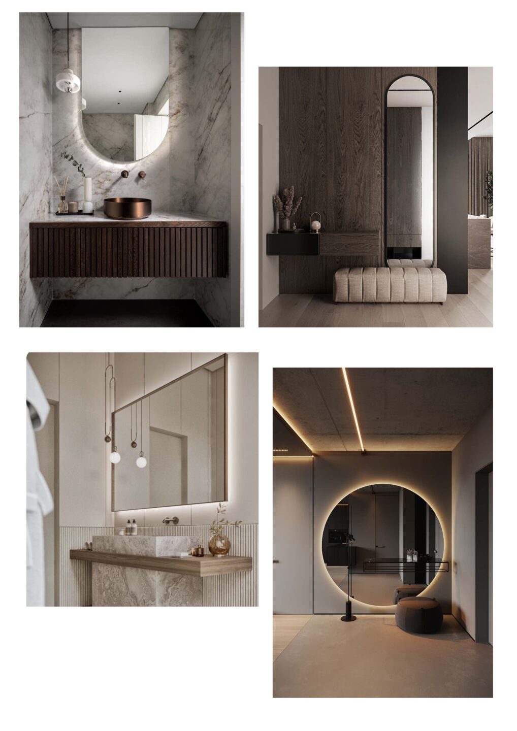 Łazienkowe lustro w stylu quiet luxury – koniecznie z podświetleniem, najlepiej o organicznej formie; pięknie wpisze się np. w proste linie marmurowej umywalki czy też podkreśli użylenie kamienia na ścianie