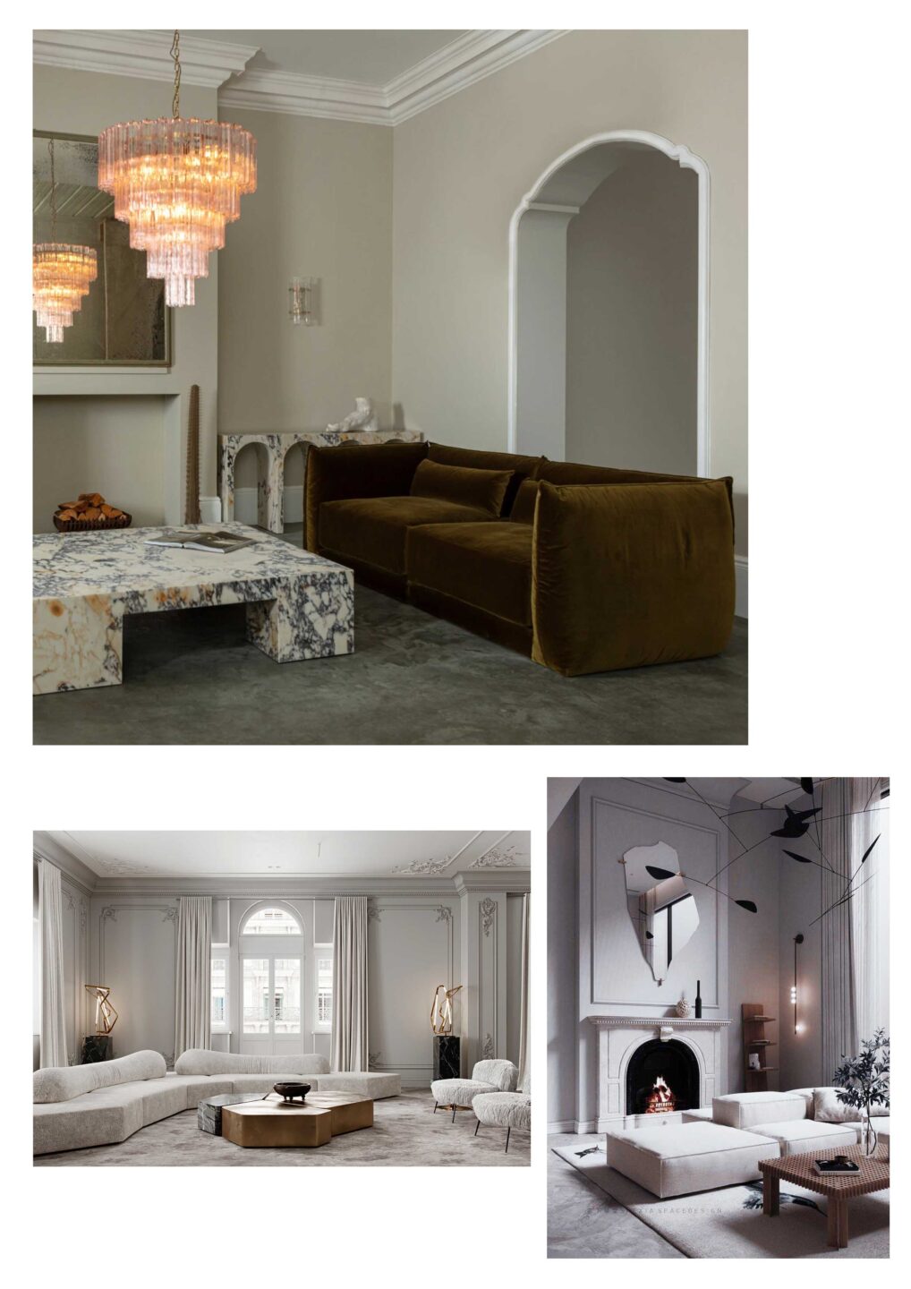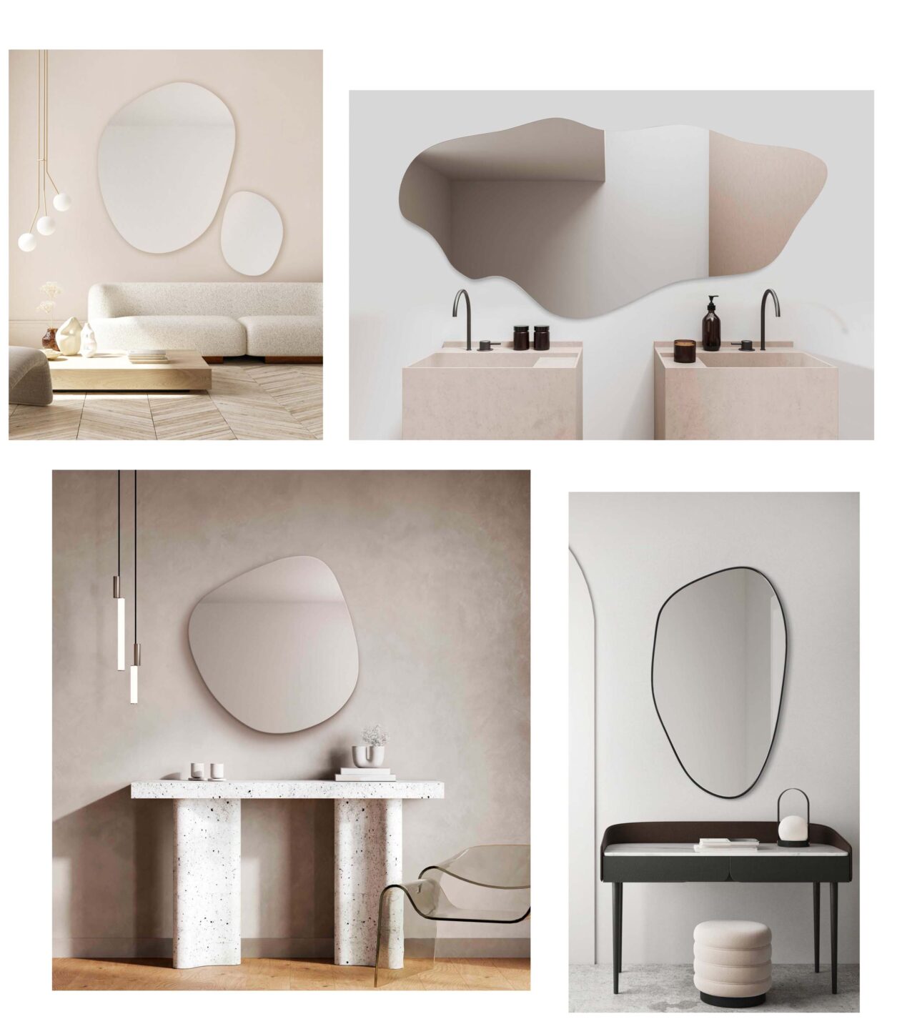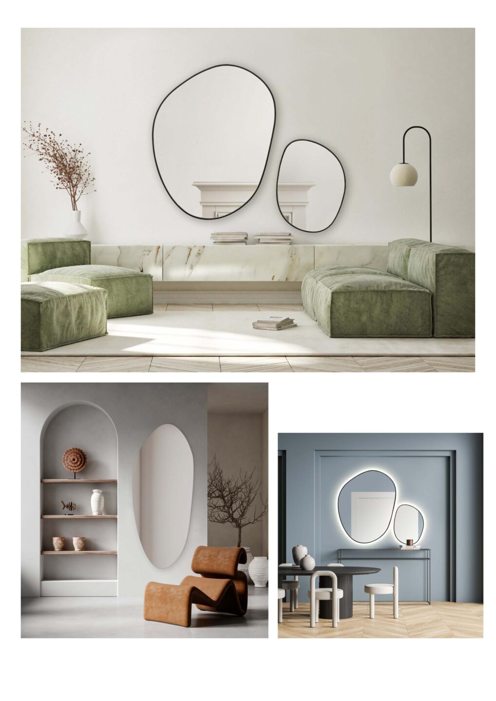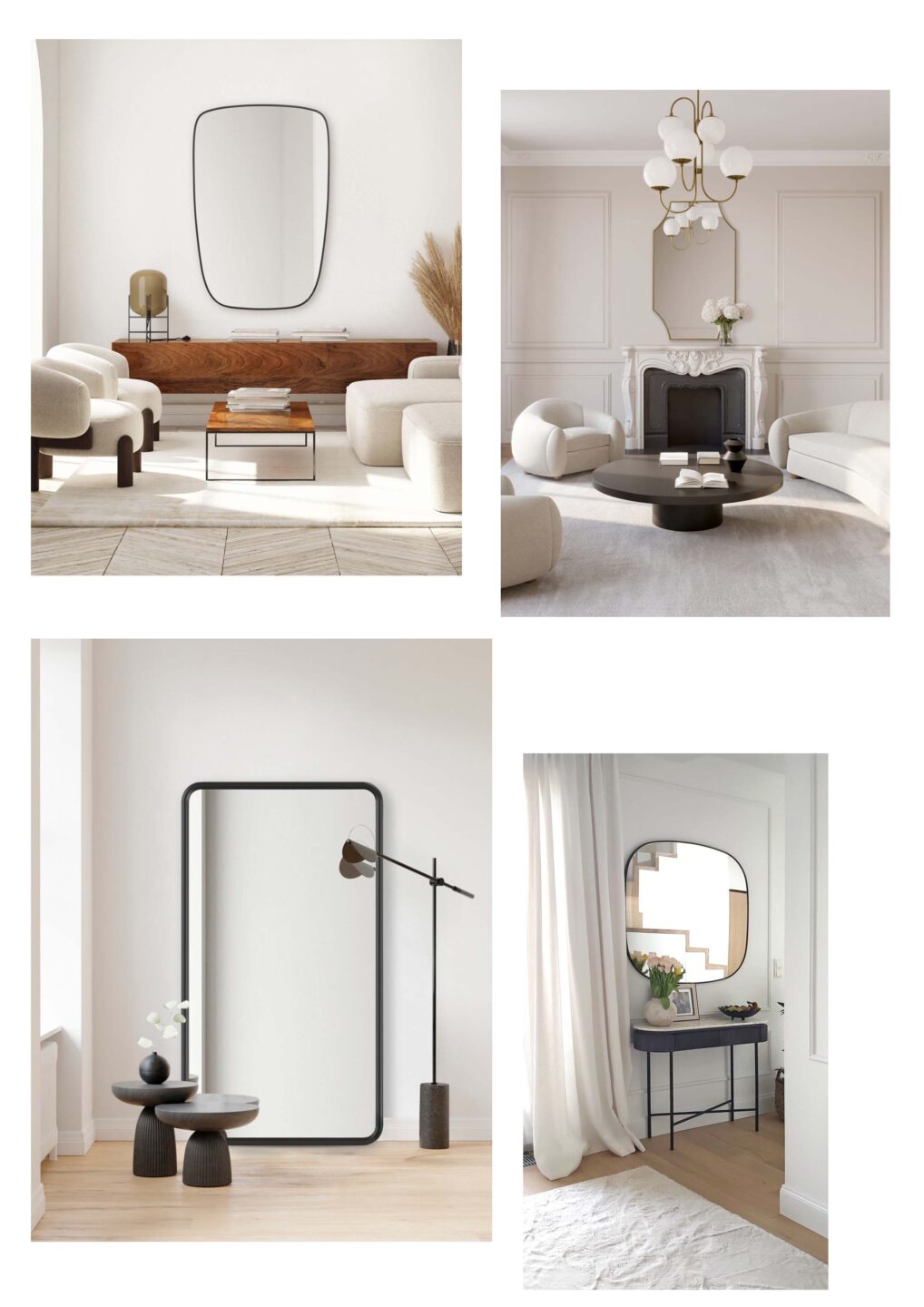Lustro do salonu w stylu quiet luxury – tutaj mamy szereg możliwości, od klasycznych luster z łukiem w stylu vintage, poprzez nieregularnie zaoblone lustra, po organiczne wybujałe formy; nieważne, którą z nich wybierzesz lustro w stylu quiet luxury będzie piękną i funkcjonalną alternatywą dla klasycznego obrazu powieszonego na ścianie