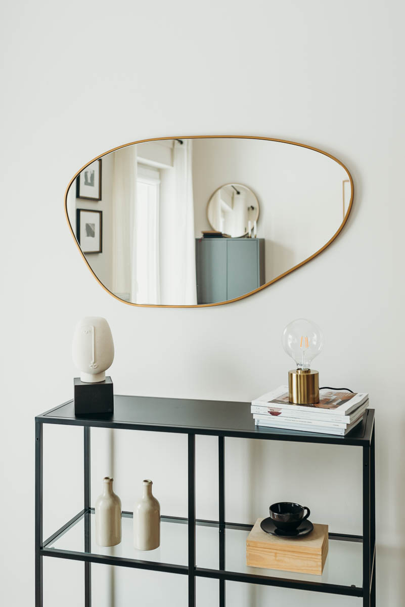 Nieregularne lustro o organicznym kształcie ze złotą ramą – elegancki dodatek do każdego wnętrza