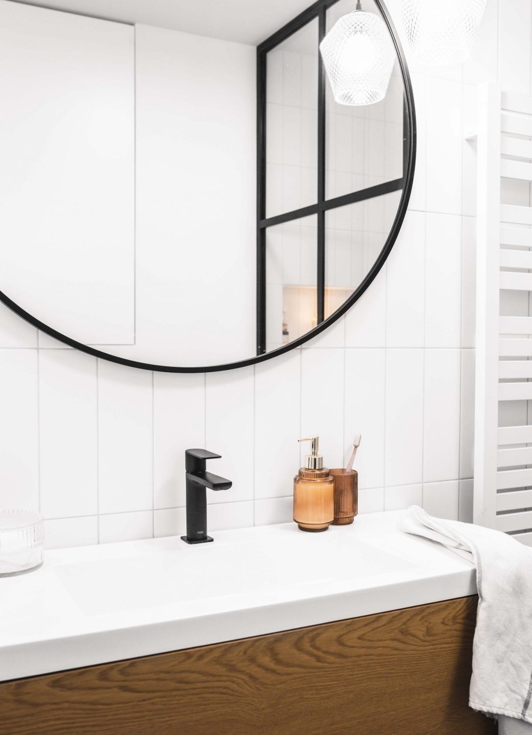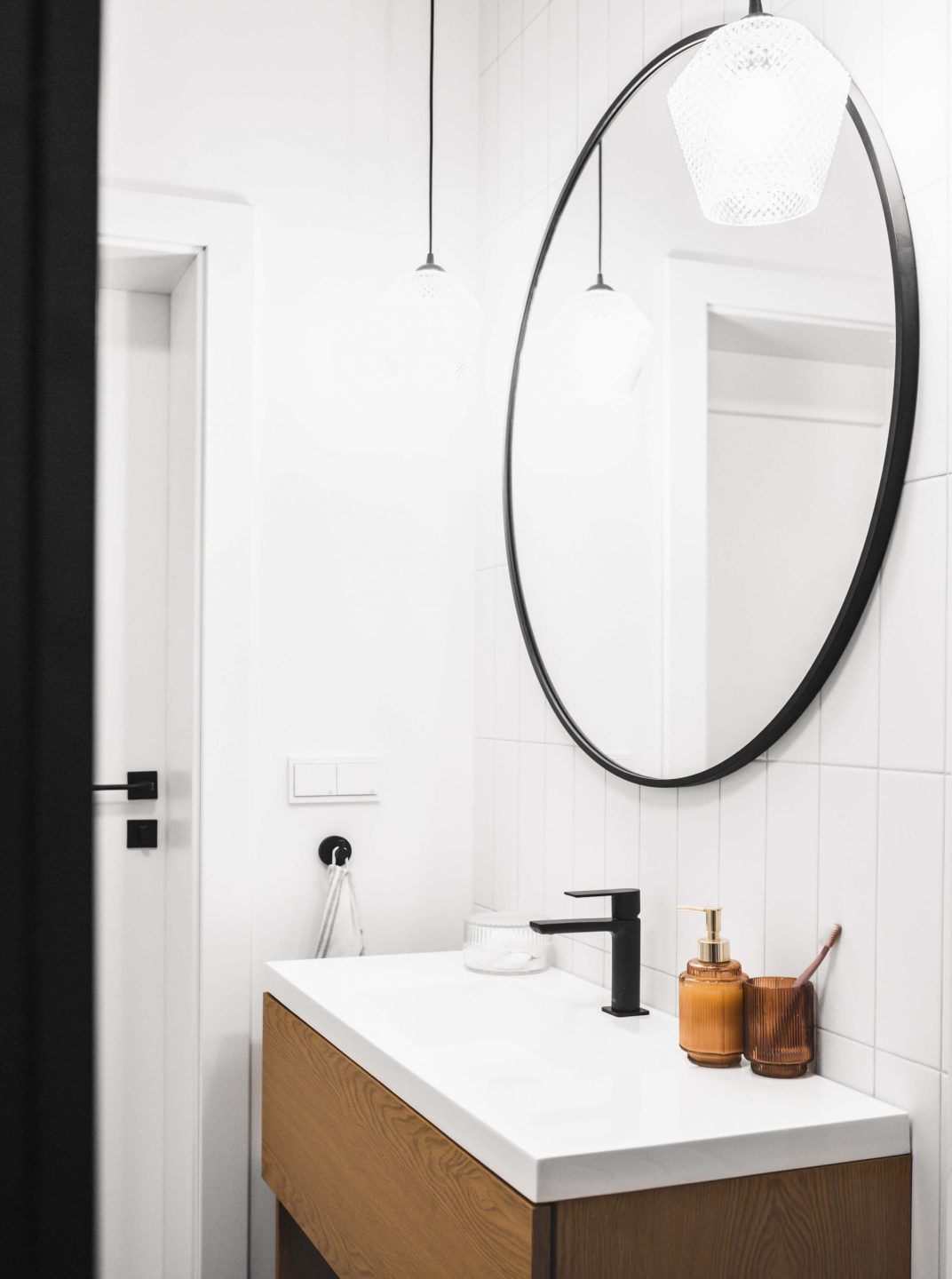 Jeżeli nie chcesz przesadzić z dekoracjami w swojej łazience, postaw na lustro okrągłe w ramie. Jego prosta forma będzie modna przez długie lata. Z kolei, aby nadać bardziej dekoracyjny charakter zwierciadłu, powieś przed lustrem zwisającą swobodnie lampę z sufitu. Jeżeli jesteś szczęśliwym posiadaczem dużej łazienki, zdecyduj się na lustro łazienkowe o średnicy 100 lub 120 cm. Tak duże lustro powiększy optycznie Twoje wnętrze i wzbudzi każdego w zachwyt. Jeżeli natomiast w łazience posiadasz dwie umywalki, powieś 2 lustra obok siebie. Dzięki temu każdy z użytkowników będzie mógł swobodnie przeglądać się w swoim zwierciadle. Dodatkowo stworzysz piękną dekorację swojej łazienki.