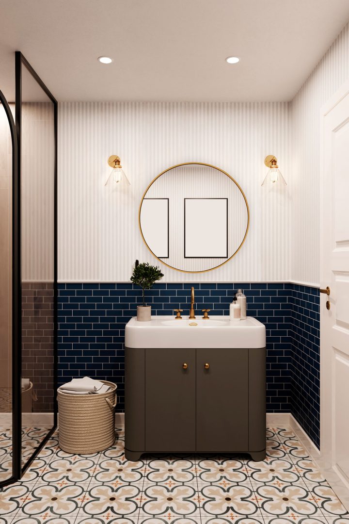 Złoty kolor nie tylko dobrze komponuje się z ciemnymi barwami. Wspaniale współgra też z bielą – to połączenie uczyni łazienkę szykowną i niezwykle reprezentacyjną. Metaliczny połysk armatury łazienkowej oraz kinkietów sprawi, że pomieszczenie nabierze niecodziennego wyrazu.