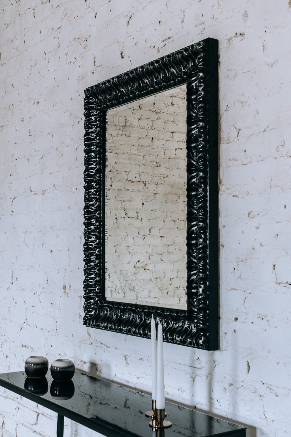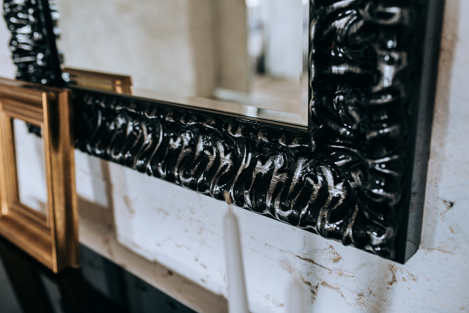 Dekoracyjne, bogato zdobione lustro w czarnej ramie to przedstawiciel klasyki w najbardziej rasowym wydaniu. Drewniana rama jest lakierowana na wysoki połysk. Drobne i staranne ornamenty pokryte lakierem odbijają światło nadając blasku. Drewniane wykończenie ramy dodaje szlachetności i poczucia solidności. Lustro wykonane jest z belgijskich szkieł najwyższej jakości. Lustro z tyłu posiada dwa zaczepy, które na życzenia klienta ustawione są do montażu w pionie lub poziomie. Po zamontowaniu rama nie odstaje od ściany. Na życzenie zamawiającego istnieje możliwość pokrycia tyłu tafli lustra folią ochronną – pozwoli to uniknąć rozbryźnięcia się szkła na drobne odłamki w przypadku stłuczenia. Rozmiar lustra dostępny jest w dowolnym formacie. Lustro może być również dostosowane do stawiania go na podłożu. Wszystkie elementy produktu tworzone są w Europie z najwyższej jakości materiałów. Nie używamy tanich elementów sprowadzanych z Chin.