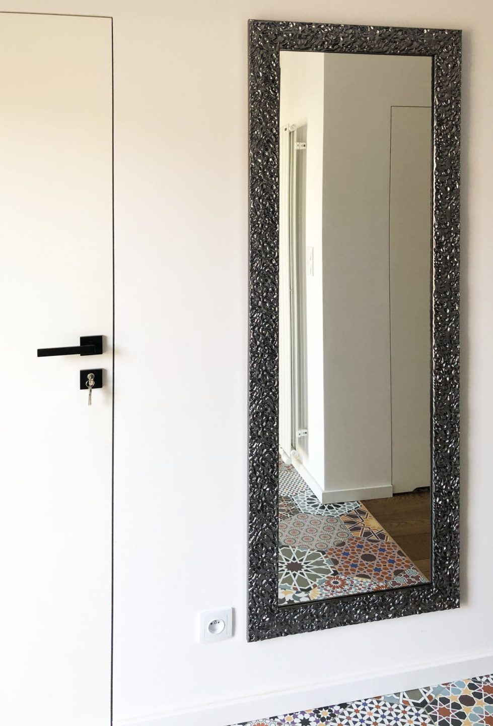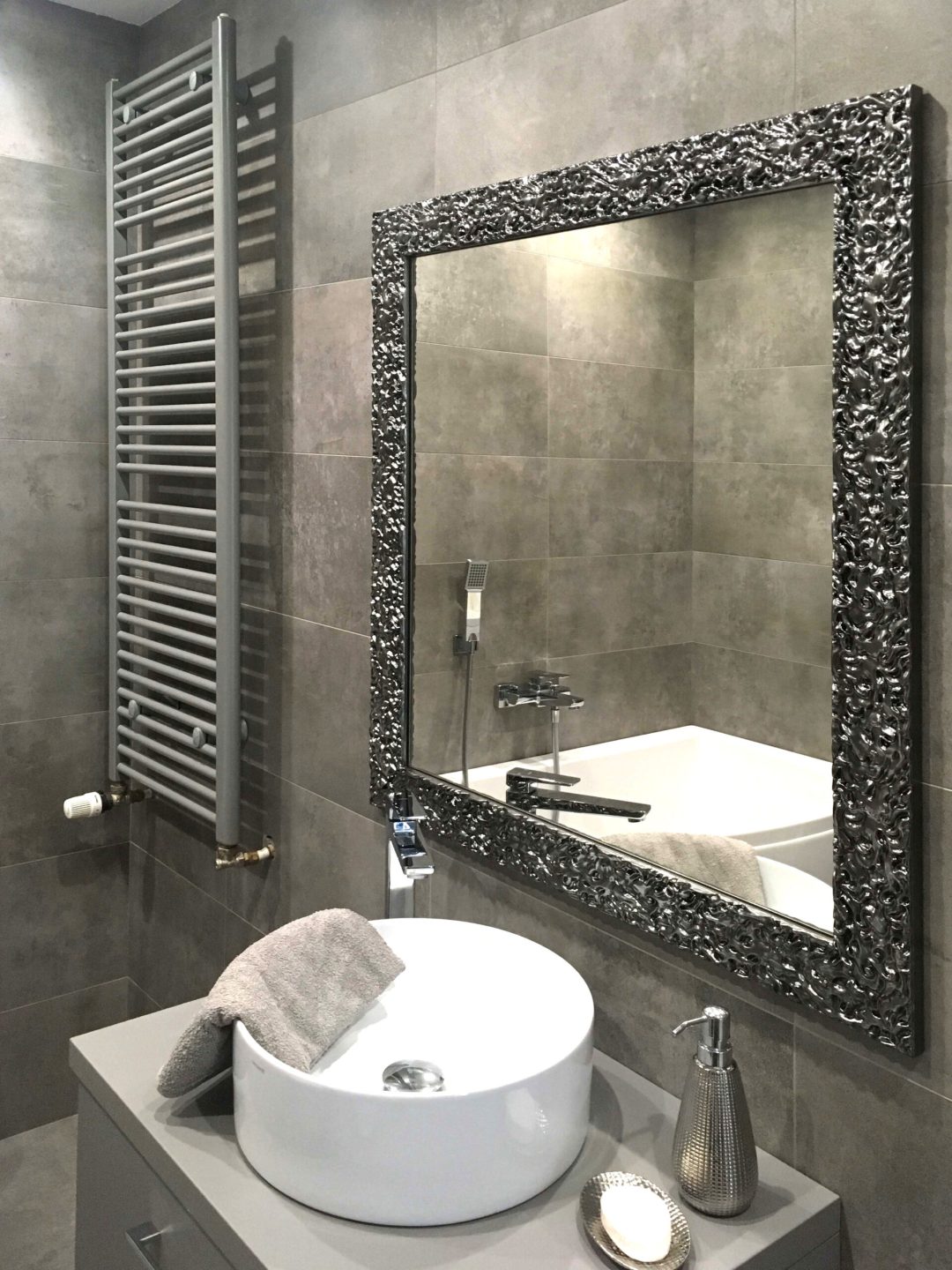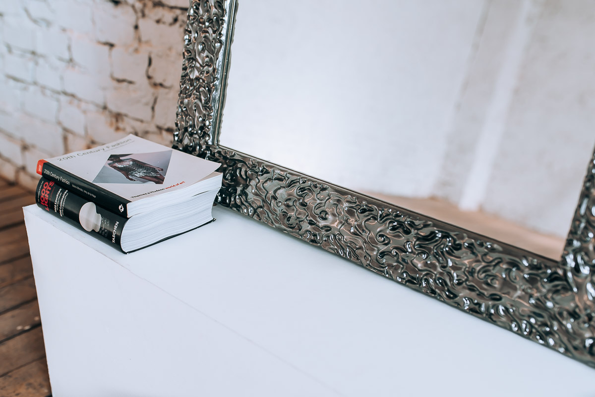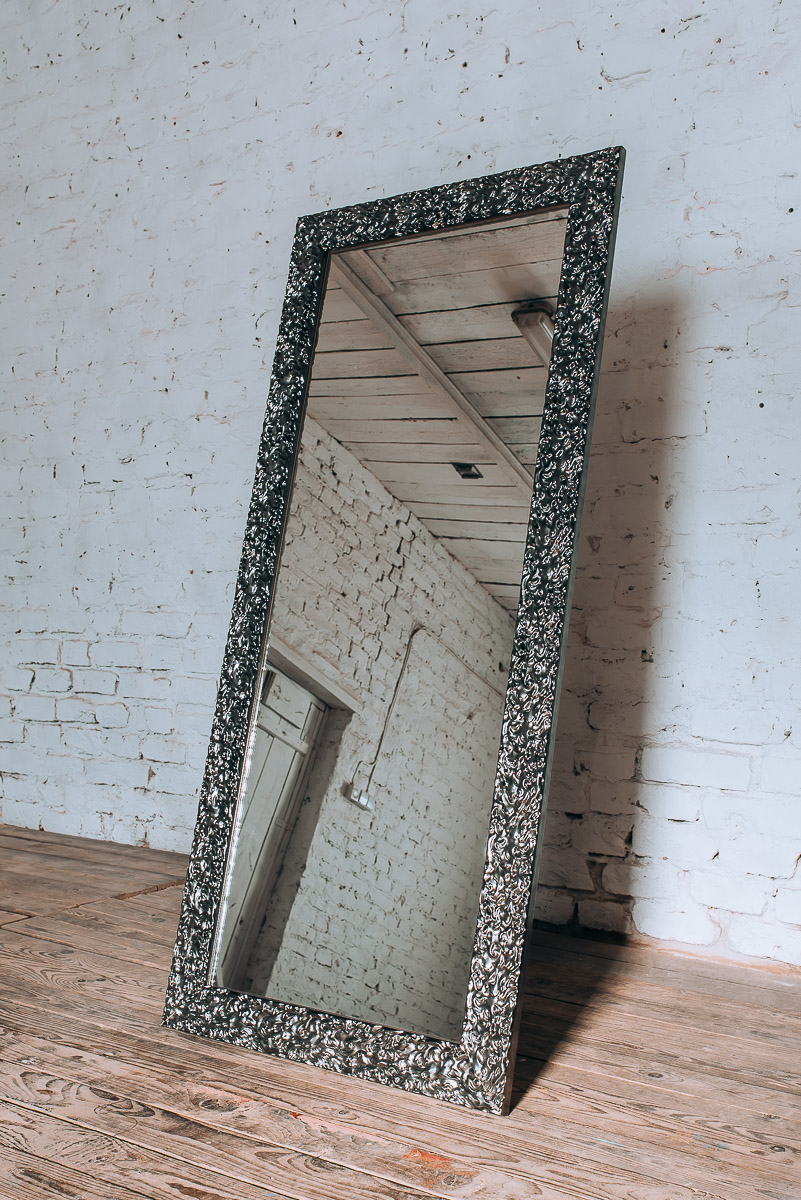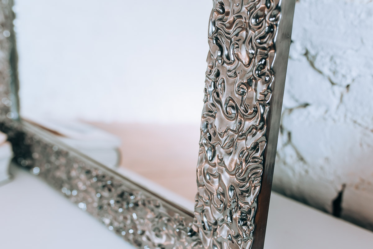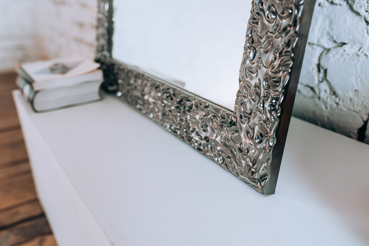 Dekoracyjne lustro w prostokątnej srebrnej ramie charakteryzuje się nietypową ramą z fakturą, która daje wizualny efekt powłoki galwanizowanej. Charakterystyczna rama wykonana jest z drewna, które pokryto grafitowym połyskującym lakierem. Niebanalny kształt powierzchni ramy w połączeniu z lakierem sprawia, że jej drobne części odbijają światło tworząc elegancki efekt wizualny. Barwy ramy dostępne są również w odcieniu bieli, czerni, złota oraz jasnego srebra. Lustro na życzenie zamawiającego dostępne jest w dowolnym rozmiarze. Szerokość ramy wynosi 80 mm, zaś jej wysokość to 20 mm. Tafla lustra wykonana jest z najwyższej klasy belgijskich szkieł o grubości 4 mm. Z tyłu lustra umieszczone są zaczepy do pionowego lub poziomego montażu. Na życzenie klienta zaczepy możemy umieścić w obu płaszczyznach, aby móc poszerzyć możliwości aranżacyjne. Z racji drobnego i bogatego zdobienia, ramę lustra przed myciem należy odkurzyć miękką miotełką – pozwoli to uniknąć osadzania się kurzu w drobnych zakamarkach i szczelinach. Każdy produkt traktujemy indywidualnie i przeprowadzamy dokładną kontrolę jakości zanim wyślemy go do klienta.