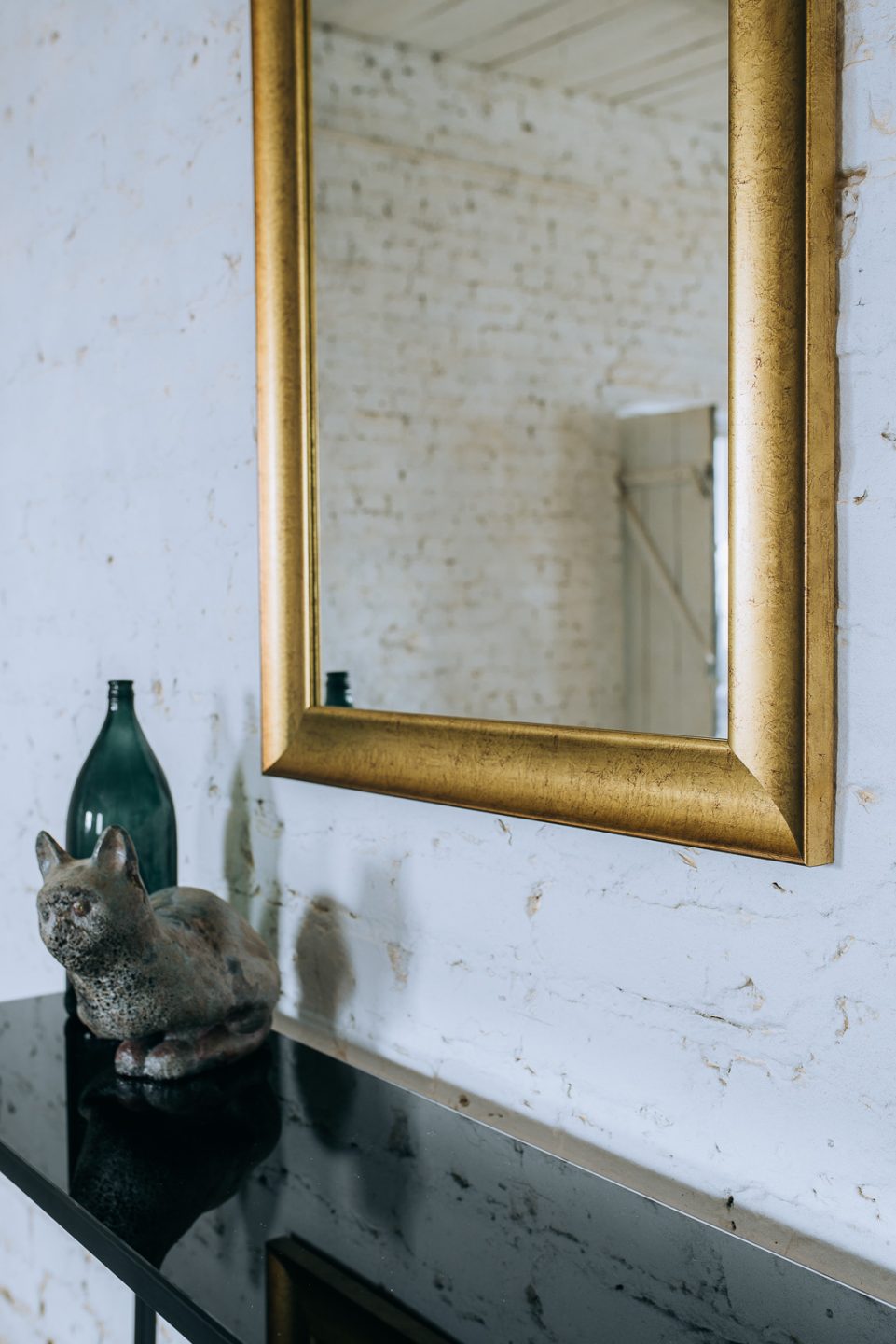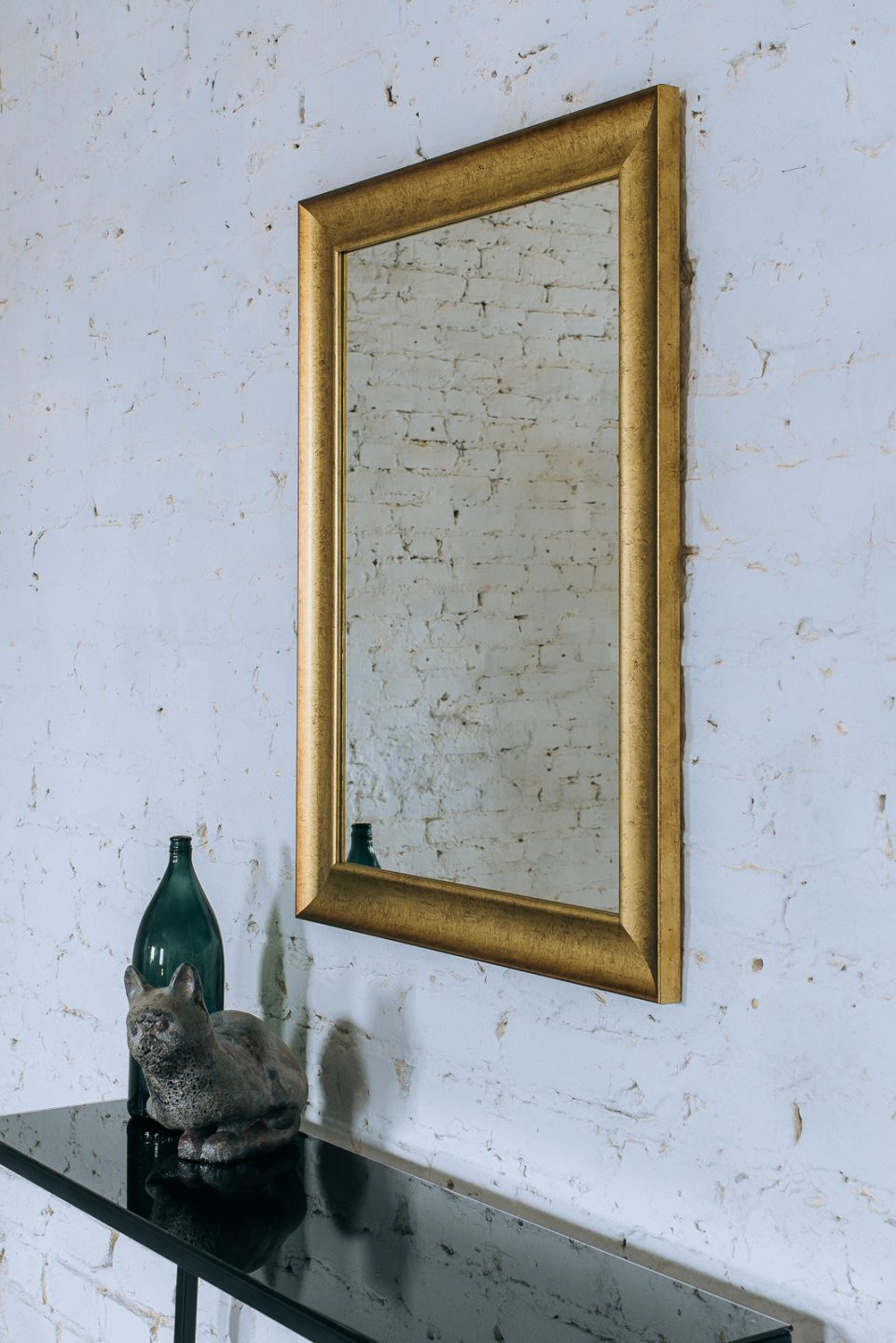 Stylowe lustro z klasyczną złotą ramą wyjątkowo dobrze wpisuje się w aktualne trendy aranżacyjne. Model prezentowany na zdjęciu ma charakter poglądowy, ponieważ właściwy format lustra zależy od indywidualnych potrzeb i decyzji klienta. Dzięki temu możliwe jest zamówienie luster w jednolitej stylistyce do wielu pomieszczeń – np. do łazienki, przedpokoju i salonu lub do jadalni oraz garderoby. Listwy, z których wykonano ramę lustra pochodzą od europejskiego producenta, a samo lustro może być dostosowane do powieszenia w pionie lub w poziomie.