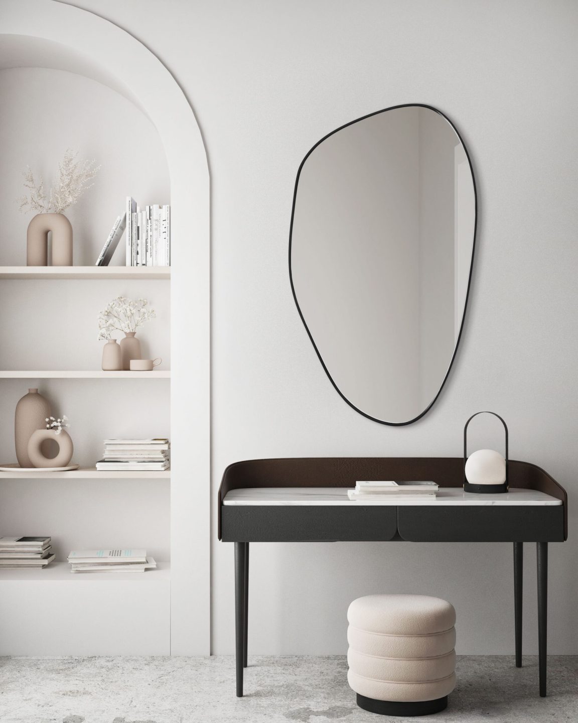 Nieregularne lustro o organicznym kształcie w minimalistycznej ramie w kolorze czarnym