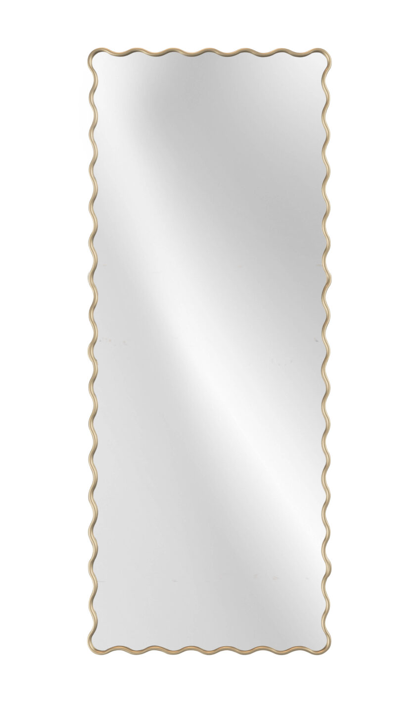 Jak pogodzić miejski, dynamiczny i zabawny styl Memphis z łagodnością organicznych wpływów? Ten pierwszy ma pazur, wymyka się konwencjom, miksuje formy i często szokuje. Na pewno wywołuje emocje, podczas gdy styl bliski naturze je uspokaja, koi. W jednym lustrze w wydłużonej złotej ramie znalazło się miejsce dla obu estetyk. Z zupełnie innych światów, a jednak się pogodziły, pomieściły. Może to za sprawą obopólnej tęsknoty za retro, „the good old times”, kiedy żyło się spokojniej. Jest więc w tej falistej ramie jakaś wewnętrzna dynamika i konwersacja stylistyk. Lustro przypadnie do gustu ludziom uciekającym od rutyny i nudy, pomysłowych i kreatywnych. Będzie dobrze wyglądać w salonie, jak i łazience.