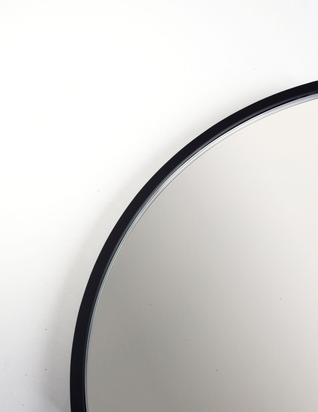 Lustro osadzone jest w czarną minimalistyczną ramę o przekroju 8 x 19 mm. Krawędzie lustra, dzięki polerowi błyszczą się, nadając całości dodatkowy walor estetyczny. Z tyłu lustra znajdują się dwie zawieszki, które umożliwiają bezpieczny montaż na ścianie. Prosty system montażu pozwala na łatwe i szybkie zawieszenie lustra, przy czym lustro nie odstaje od ściany.