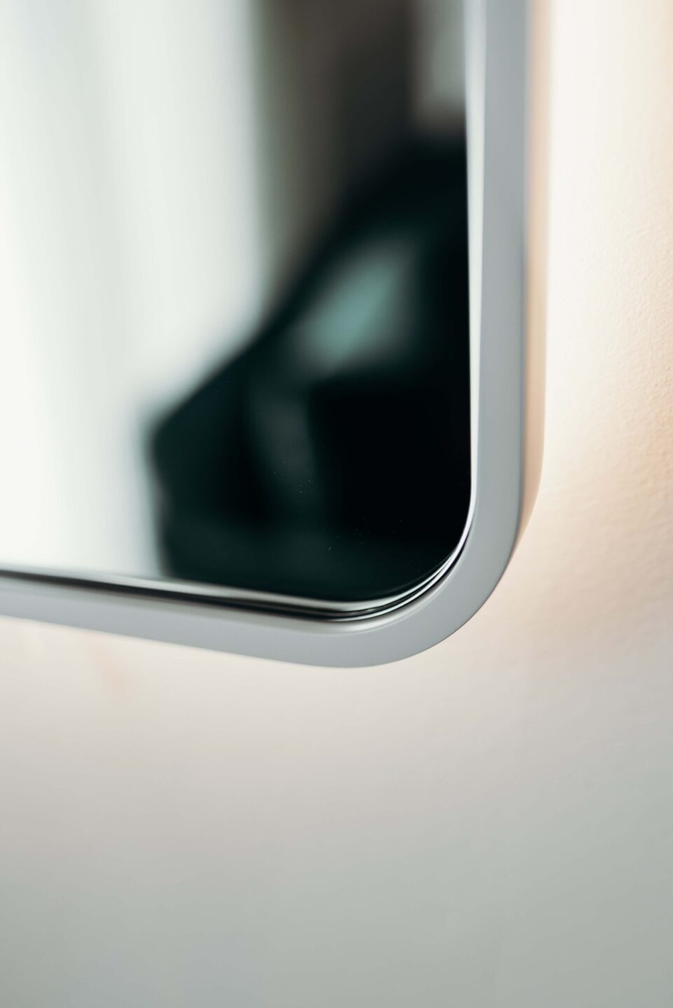 Rama lustra wykonana jest z płyty MDF lakierowanej w odcieniu białego matu, która jest odporna na działanie wilgoci. Tafla lustra to najwyższej jakości belgijskie szkło o grubości 4 mm. Wysokość ramy to 19 mm, a jej szerokość wynosi 8 mm. Dystans lustra od ściany wynosi 1,5 cm. Z tyłu znajdują się zaczepy do montażu. Lustro dostępne jest w różnych formatach. Produkt posiada funkcję podświetlenia LED, które dostępne jest w 2 wersjach kolorystycznych i 2 opcjach uruchamiania. Dostępna jest neutralna i ciepła barwa światła. Sposoby włączania światła to: naścienny lub dotykowy. Światło rozchodzi się równomiernie i nie widać pojedynczych punktów diodowych z racji zastosowania mlecznego klosza. Każde zamówienie traktujemy personalnie i indywidualnie.