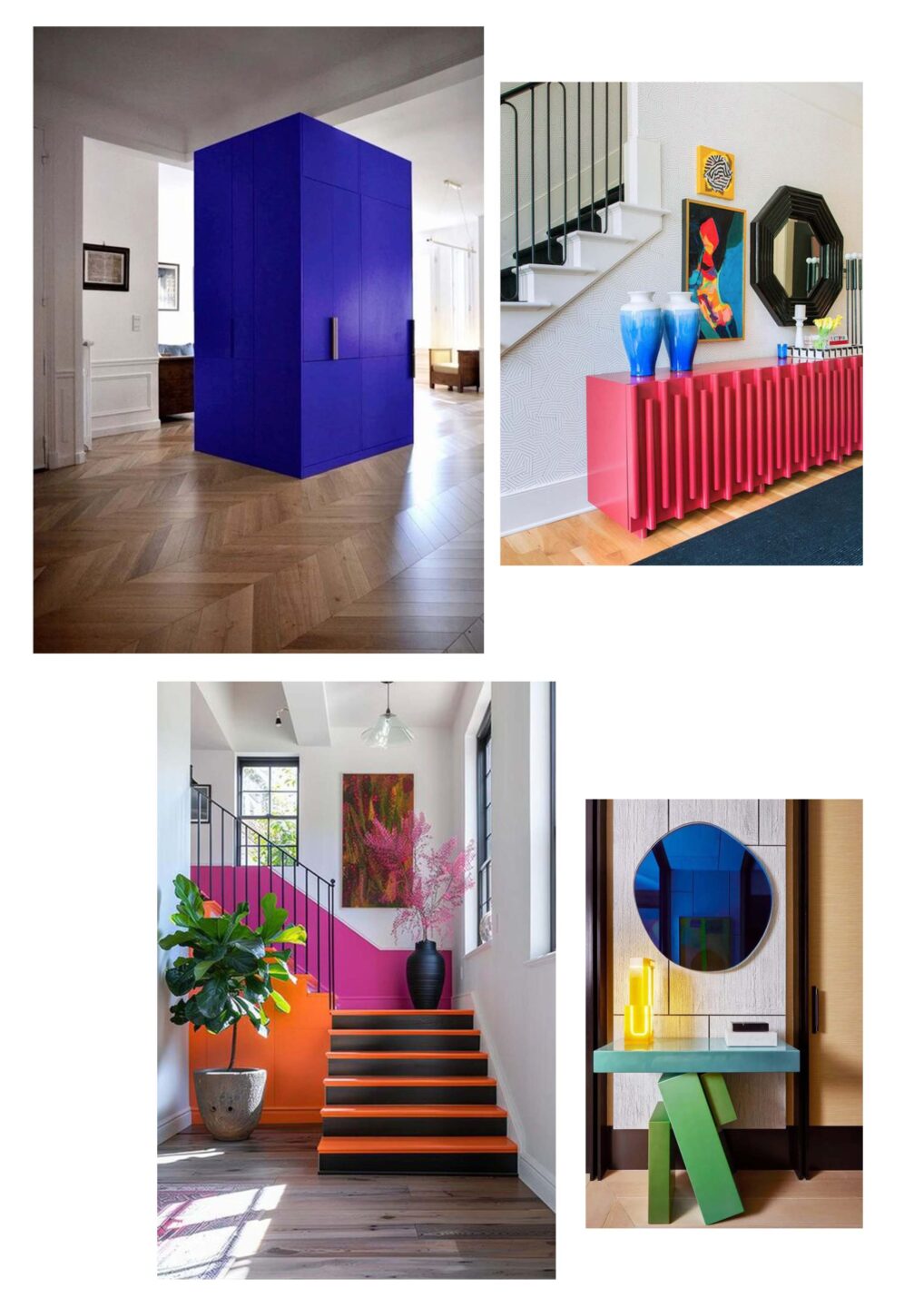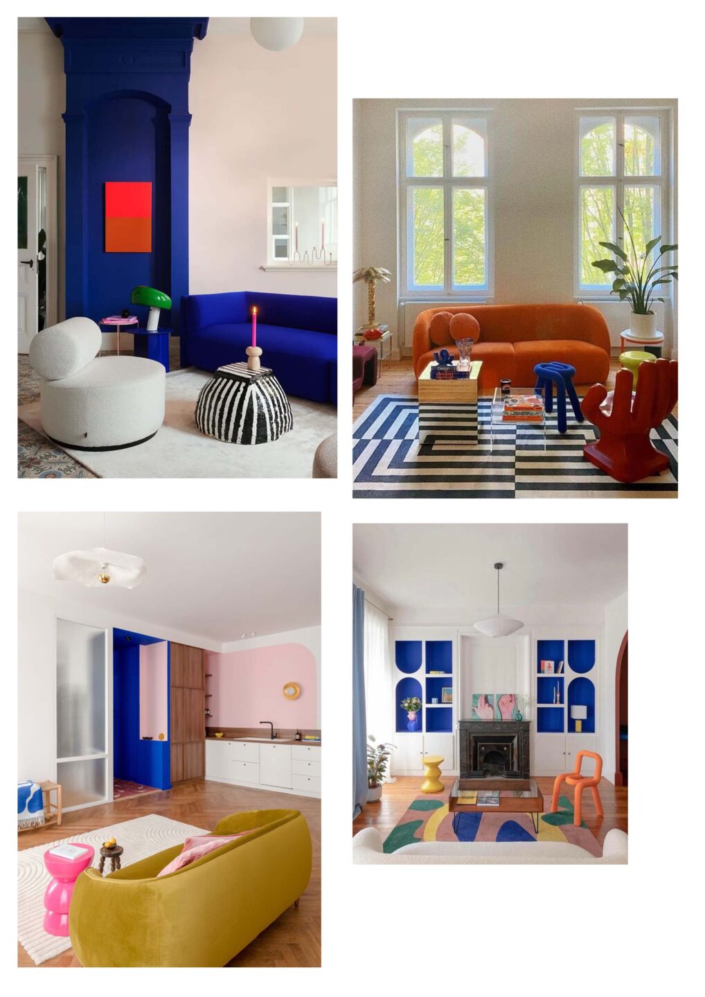 Intensywne kolory i wzory: trend Dopamine Decor kocha barwy, które energetyzują i inspirują. Wnętrza pełne są żywych kolorów takich jak wyraziste odcienie niebieskiego, różu, pomarańczy czy fioletu, które mieszają się z dynamicznymi, często geometrycznymi lub abstrakcyjnymi wzorami. Te odważne wybory mają na celu pobudzenie umysłu i wywołanie uczucia radości przy wykorzystaniu kolorów.